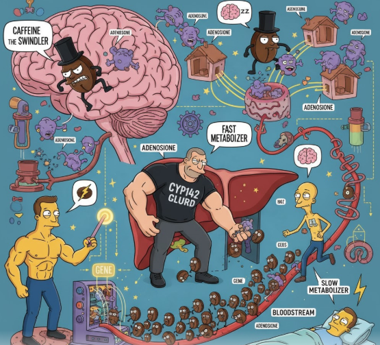 범인은 내 유전자안에 있다. 애초에 카페인은 뇌의 피로 물질인 아데노신이 자리 잡고 있는 전세집을 빼앗은 후에, “이제 괜찮아~ 너는 피곤한 게 아니야~”라며 뇌를 속이는 치명적인 사기꾼이다. 그런데 우리 간에는CYP1A2라는 카페인 분해 효소가 있다. 사기꾼 카페인을 내쫓아 내는 클럽 가드 역할을 한다. 이 분해 효소를 얼마나 잘 만들어내느냐 못하느냐는 전적으로 유전자에 달렸다. 카페인을 강렬한 속도로 분해하는빠른 대사자로 태어나느냐, 하루 종일 밤새 카페인을 붙들고 살아가야 하는느린 대사자로 태어나느냐는 오로지 조상님들이 물려주신 유전자에 달렸다. 느린 대사자로 태어난 사람은 저녁 커피 한 잔이 새벽 내내 혈관을 타고 흐르는 카페인의 유람을 강제로 목격해야 한다.