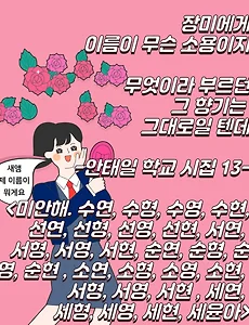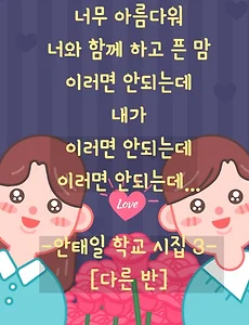 학교 유머 시리즈140 안태일 학교시집 51 -60 난동은열정으로 무기력은차분함으로 문제 행동은발전 가능성으로 이기심은자기주장이 강함으로 거짓과실존에 대한 짧은 고민긴 한숨 그리고 빠른 손놀림 -안태일 학교 시집 51- [행동 특성 및 종합의견 입력중] 내가 아는단한가지 나는아마망했다는 것 -안태일 학교 시집 52-[다음 글을 통해 알 수 있는 것은 (4.7점) ] 단 한번의 선택 끝없는 경우의 수죄여 오는 기회비용 -안태일 학교 시집 53-[엄마한테 할까? 아빠한테 전화할까?]예측된미래단 하나의 첫단추밀려드는불편한 미래 -안태일 학교 시집 54-[선생님, 저도 조퇴 좀] 긴박했던 여정의끝에 서있었네안도의한숨일까거짓을 향한분노일까. -안태일 학교 시집 55-[응? 너 안불렀는데] 시공간의 카오스시간을 지배하는마법 주문 안태일 학교 시집 56-[보건실 다녀.. 2017. 10. 22. 안태일 학교시집 41 -50 문 여닫는소리에 귀를 쫑긋 쫑긋 여인들이 문을 열때마다 나는 아니길, 나는 아니길 -안태일 학교 시집 41- [고사 본부] 그대 누구인가 내게 주어진 공간에 내게 주어진 시간에 머리 빼꼼 헤집고 들어온 그대 누구인가 -안태일 학교 시집 42- [어? 시간표 바뀐거 아니었나요? 이 반 맞는데] 사랑스런 물음 알고싶은 사람 알려주고픈 사람 둘 모두 행복하게 해주는 사랑스런 그 물음 -안태일 학교시집 43- [오늘 점심 메뉴 뭐냐?] '정혁이요!' 난 그 이름을 물어본것이 아니었네 괜시리 알아버렸네 모르고 싶었네 -안태일 학교 시집 44- [이러면 도대체 세상 천지에 누가 좋다 하겠니? 어!] 저 높이 높이 올려보아도 이 낮게 낮게 낮쳐보아도 좀처럼 변하지 않는 너의 숫자들 -안태일 학교시집 45- [난이도와.. 2017. 10. 18. 안태일 학교시집 21 - 30 그게 생각처럼 빨리 되질 않아요 ------ 안태일 학교 시집 21 [화장실 다녀왔는데요] 쉽사리 돌이킬수 없는 삶의 순번 작은 희생으로 또다른 생명을 살리듯 정해진 운명에 대한 미안함.. --------------- 안태일 학교 시집 22 [애네 반만 계속 첫번째 반이네] 네 라고 해야하나요 아니요 라고 해야하나요 그게 좀. 많이. 좀. 헷갈려요. ------ -안태일 학교 시집23- [신발 안 벗어?] 그 이유가 궁금하신건지 왜 묻는 건지 대답해야 하는지 모르겠어요 -안태일의 학교 시집24- [왜 떠들어?] 사랑이란 누군가에게 주었다면 받지 않아도 되는것 허나 사랑이란 누군가에게 받았다면 그만큼 주어야 하는것 그러나 이 사랑, 어쩌란 말인가. -안태일 학교 시집 25- [반장 엄마의 애니팡 하트] 검.. 2017. 10. 18. 안태일 학교 시집 11 - 20 아니야 이게 아니쟎아 왜 이제서야 그런 말을 해 분명 나 그대에게 보냈는데 그대 내게 화만 내네 -안태일 학교 시집 11- [ 업무 담당자의 쿨메신저] 아니었는데. 이런 뜻이 국어 사전에는..... 분명.. -안태일 학교 시집 12- [ '쉬는시간' iN 초등] 장미에게이름이 무슨 소용이지 무엇이라 부르던그 향기는 그대로일 텐데 -안태일 학교 시집 13- 왜 늘 이제와서야 늘 왜 -안태일 학교 시집 14- [시험지오류] 나는 하나를 물었고 너는 인생을 답하네 -안태일 학교 시집 15- [반성문] 좀처럼 만날 수 없던 그대들 오손 도손 한자리에 모여있네 -안태일 학교 시집 16- [당구 동아리] 사랑해요 미안해요 앞으로 내가 잘할게요 -안태일 학교 시집17- [답안지 뒷면] 그냥 네가 다 먹어 그렇게 나눌.. 2017. 10. 18. 안태일 학교 시집 1 - 10 너의 말 너의 목소리 들리질 않아 시끄러워 집어치워 네게 해야할 말 네가 해야할 일 묻지마 내게 제발 이제 그만.... -안태일 학교 시집 1- [영어 듣기 평가] 나는. 오늘. 보았네 우주 를 -안태일 학교 시집 2- [서술형 채점] 너무 아름다워 너와 함께 하고 픈 맘 이러면 안되는데 내가 이러면 안되는데 이러면 안되는데... -안태일 학교 시집 3- [다른 반] 기억 나질 않아 너와 내가 함께 걸어왔던 그 길 어디서부터 시작해야 하는 걸까 우린... -안태일 학교 시집 4- [진도 어디였지?] 내안에 나 내가 몰랐던 나 그리고 내가 아닌 나. -안태일 학교 시집 5- [자기소개서] " I don't know!!" "It's not my job!!" "Never mind!!!" "I hate you!.. 2017. 10. 18. 참교사 얼굴 (큰바위 얼굴 패러디) 초임 시절 어느날 퇴근 후 집에갈 무렵, 교무실 선생님들은 퇴근 짐을 정리하며 모여 앉아 참교사에 대한 이야기를 하고 있었다. 그 참교사의 모습은 나와는 여러 광년이나 떨어져 있을 이야기였지만 눈만 뜨면 이곳 저곳에서 그 이상적 모습에 대해 갈망하고 있었다. 대체 그 참교사란 무엇일까? 광활한 네트워크에 둘러싸인 SNS가 하나 있었다. 그 곳은 무한의 공간으로서 많은 선생들이 모여 있었다. 그 SNS에 글을 남기는 여러 교사들 중에는 가파른 산허리의 빽빽한 수풀에 둘러싸인 곳에 조그만한 분교에 교편을 잡고 사는 교사들도 있고, 또 온갖 문화 시설이 내리뻗은 역세권이나 평탄한 가정교육으로 바른 인성을 갖춘 학생들과 안락하게 사는 선생들도 있었으며, 또 한 곳에는 존재하는 모든 문제 행동을 조밀하게 터트려 .. 2017. 10. 6. 이전 1 ··· 8 9 10 11 12 13 14 ··· 24 다음